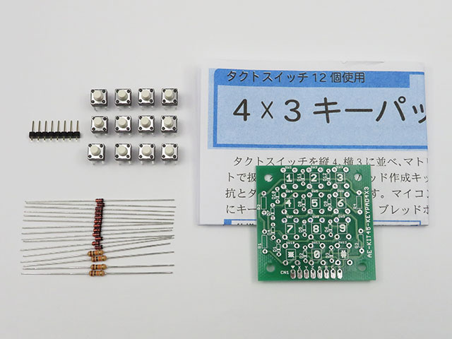タクトスイッチを縦4、横3に並べ、マトリクス配線を行い 12キーを少ないポートで扱えるようにしたキーパッド作成キットです。