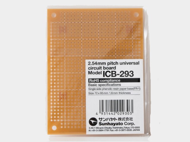 材質:紙フェノール、片面 ピッチ:2.54mm 本体サイズ:72×95×1.6t(mm) 穴径:Φ1.0、ドットパターン 仕上処理:フラックス、部品面白色シルク印刷