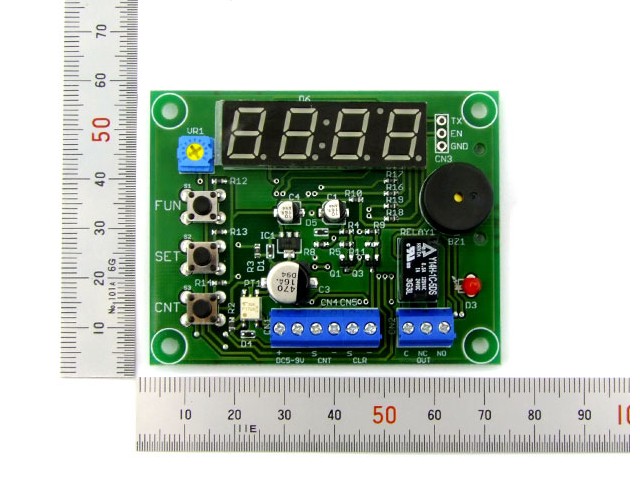 7セグメント4桁(9999)のアップダウンカウンターです。カウント値を設定すれば、その値になるとリレーが[ON/OFF]動作します。カウンターだけではなくタイマーの機能も搭載しています。時間設定は0.01秒~99.99秒、1秒~99分59秒の2モードです。電源OFFでもカウント値、設定値を保存する機能が付いていますので一旦電源をOFF後、再度ONにしても以前の続きからカウントできます。