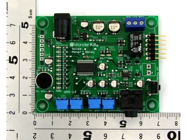 音の大きさでリレーが動く!入力された音の大きさを測り、一定レベルに達したときにリレーをONにする「音圧レベルリレー」です。音声をきっかけとした外部機器の制御が行えます。音圧レベル表示LEDを10点搭載し、レベルメータとしても使えます。音声入力は2系統で、基板実装の内蔵マイクと、外付けのダイナミックマイク(別売)からの入力切り替えが可能です。シリアル信号での外部操作にも対応しています。
