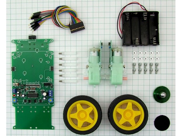 IchigoJamなどのCPUボードと組み合わせることで自律走行する車両の製作が可能な、3系統のDCモータードライバを搭載した2輪駆動の車両ベースキットです。付属説明書のIchigoJam用サンプルプログラムソースにより接触センサを使った「壁面自動回避カー」を簡単に製作できます。また、別売センサーを取り付けて「壁伝いマウス」や「ライントレースカー」などの製作用ベースとしても使用でき、ユニバーサルエリアを使用してタミヤ製のパーツを取り付けて機能を拡張可能!