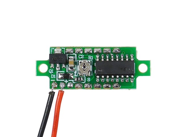 メータの駆動電源は、測定対象から供給を受けます(16mA以下)。鉛バッテリーの電圧チェックにも組み込みにも最適な超小型デジタルパネルメータです。15V以上で使用する場合には、基板上のはんだジャンパの開放と抵抗追加によって最大24Vまで測定することができます。